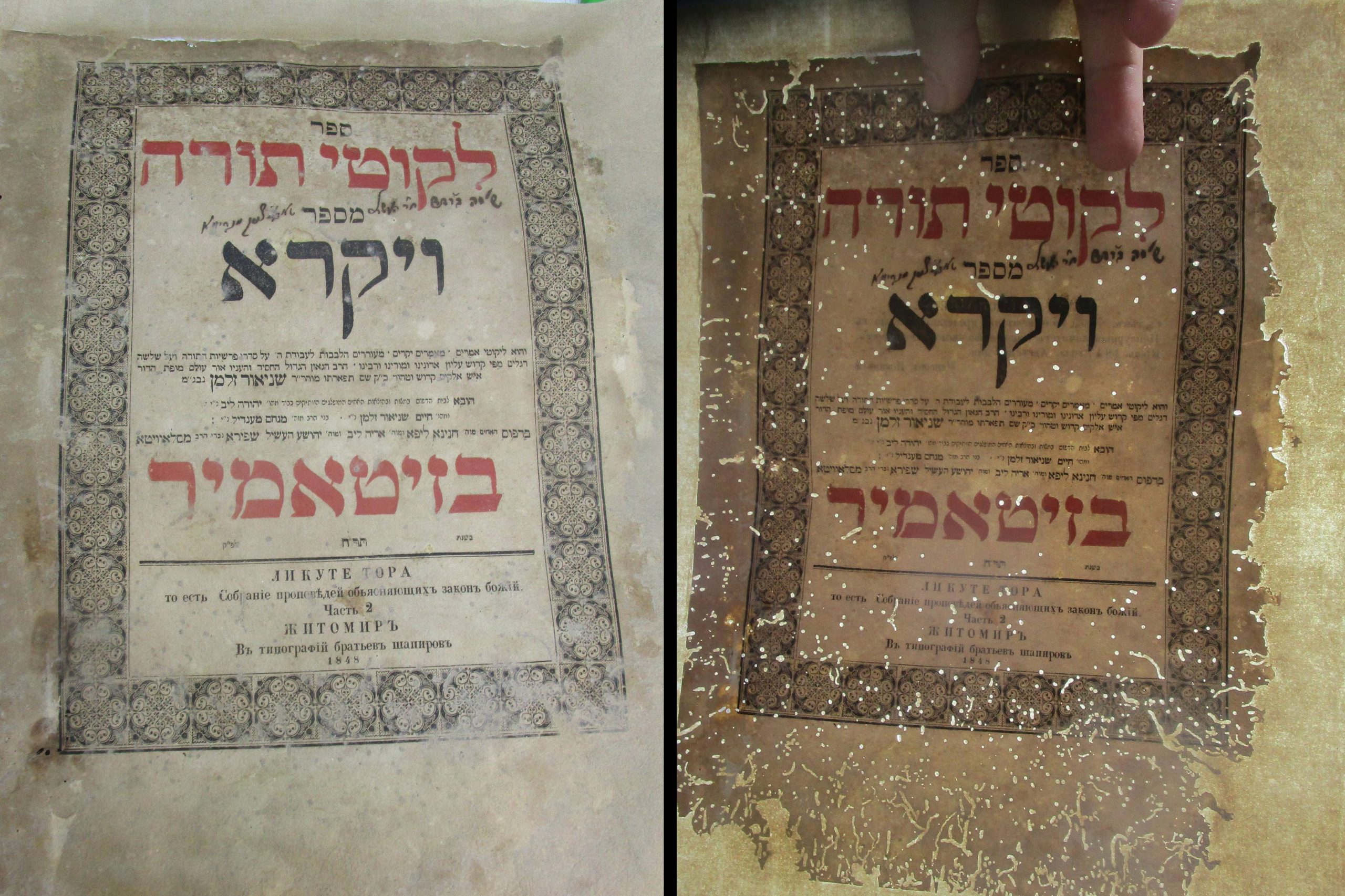 פטריה שנוצרה על דפי ספר- לפני עבודת השיקום